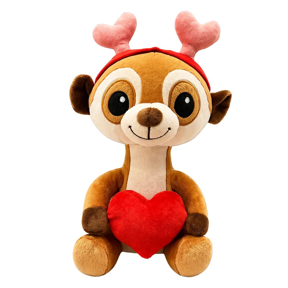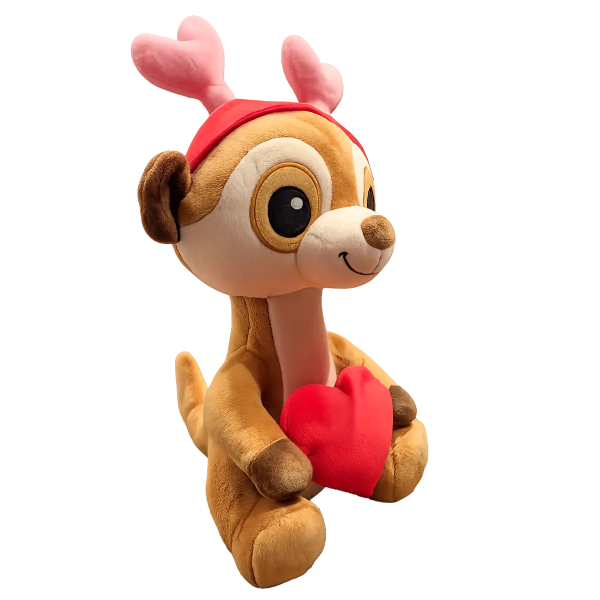 Cute plush meerkat holding a red heart, with pink antlers and a red headband, isolated on a clean white background.