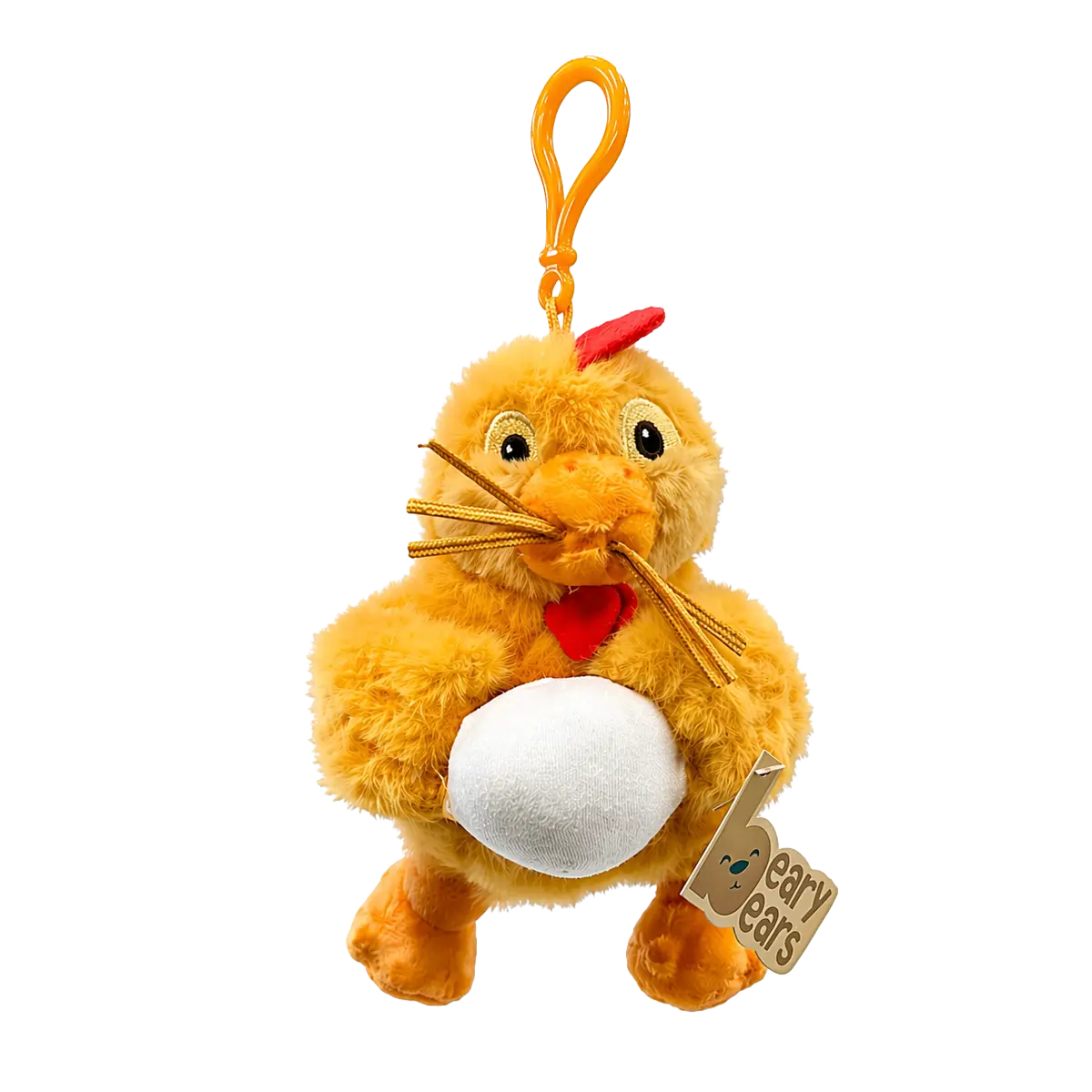 Cute chicken plush keychain holding an egg, with orange clip, red comb and soft fluffy yellow fabric on a clean white background
