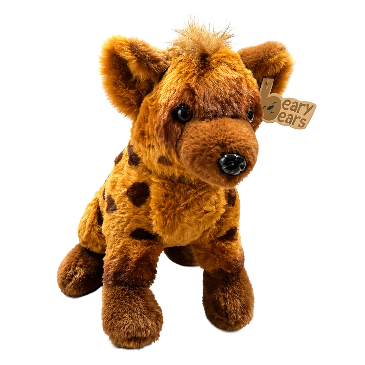 Spotted hyena plush toy with soft brown fur, dark spots and fluffy ears on a clean white background