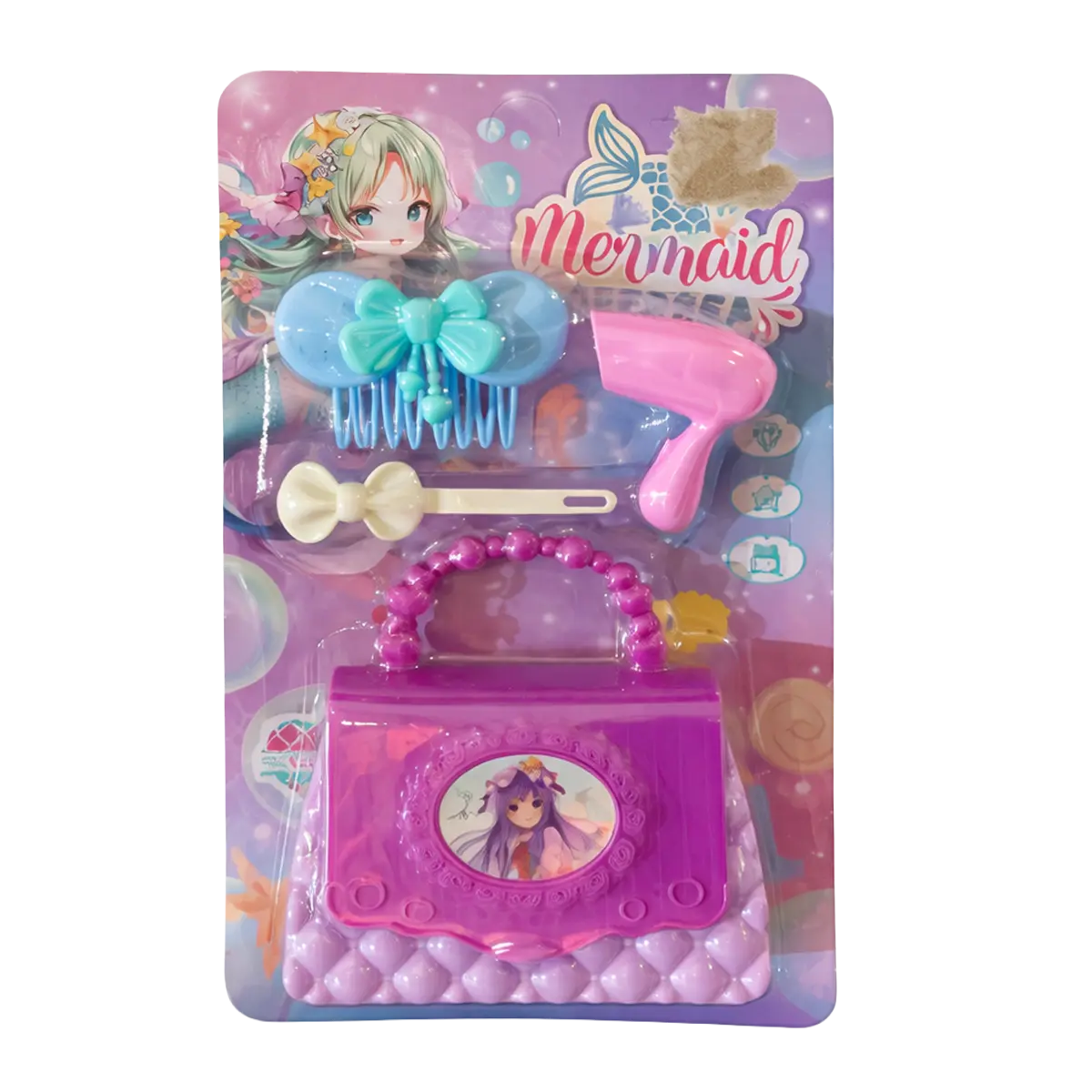 This Mermaid Deepsea toy set includes a decorative bow hair comb, a stylish hair clip, a toy hairdryer, and a pink handbag. These accessories allow children to explore different beauty and styling scenarios during play.