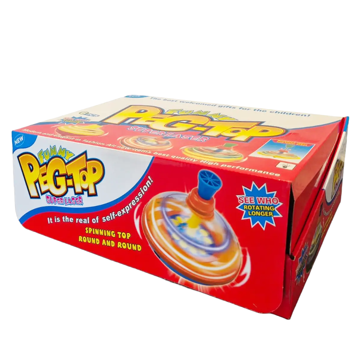 Because of its compact size and strong visual appeal, the Peg-Top Super Laser is perfect for fairs, arcades, and toy shops. The display packaging makes it easy to present and sell in bulk. Moreover, it works very well as an affordable prize or giveaway item.