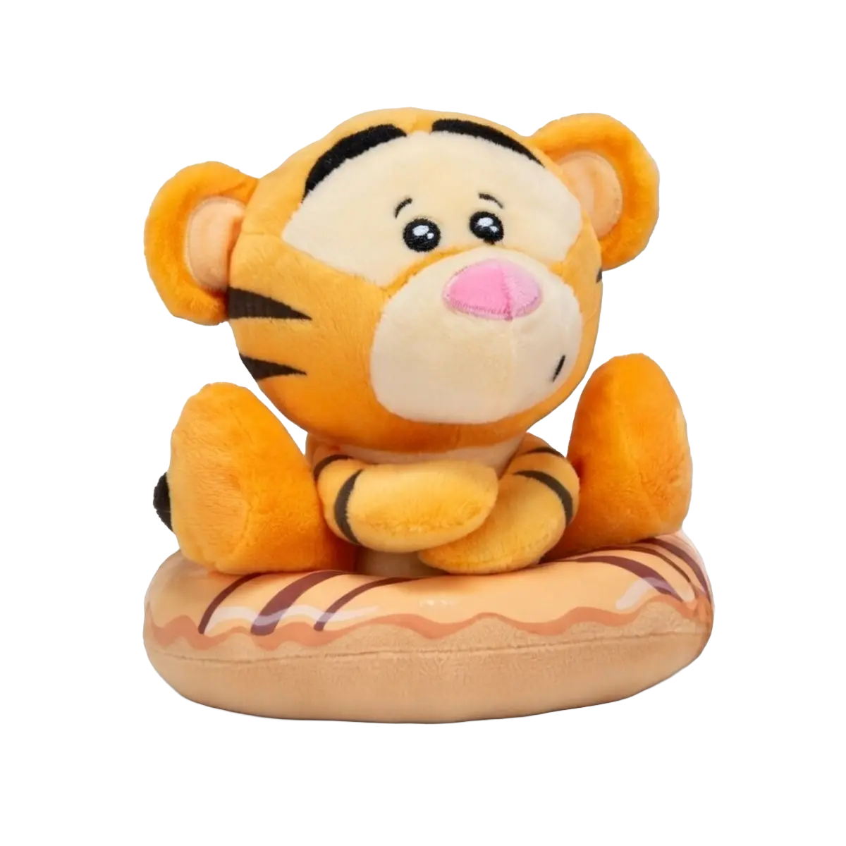 Each plush sits on a colourful donut-shaped cushion. This design gives the characters a fun and eye-catching appearance. The bright colours help the plush stand out in displays.