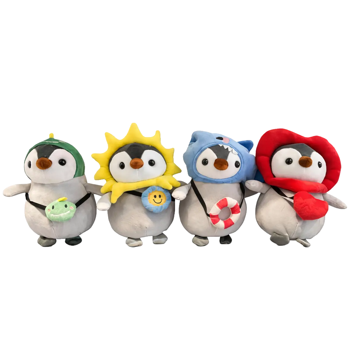 The Penguin 4 Assorted 23 cm plush is a playful and eye-catching assortment with unique themed designs. This set includes four different penguins, each featuring its own outfit such as a frog bag, sun costume, shark hoodie, and red hood. As a result, it creates a fun and varied presentation that immediately attracts attention.